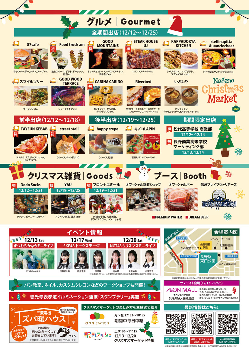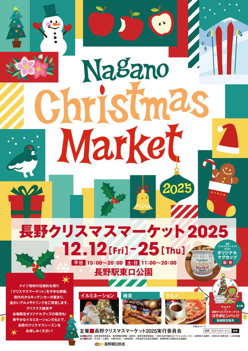2025年12月12日(金)~2025年12月25日(木)に、長野県長野市「長野駅東口公園」で『長野クリスマスマーケット2025』が開催。今年もドイツ発祥の伝統的な「クリスマスマーケット」を長野駅前に再現。県内外から多数のキッチンカーが集合して温かいグルメやドリンクが並び、クリスマス雑貨や会場限定のオリジナルグッズ販売、華やかなイルミネーションも展開します。さらに今年は、SKE48のトークショーやNGT48のクリスマスミニライブも行われます。